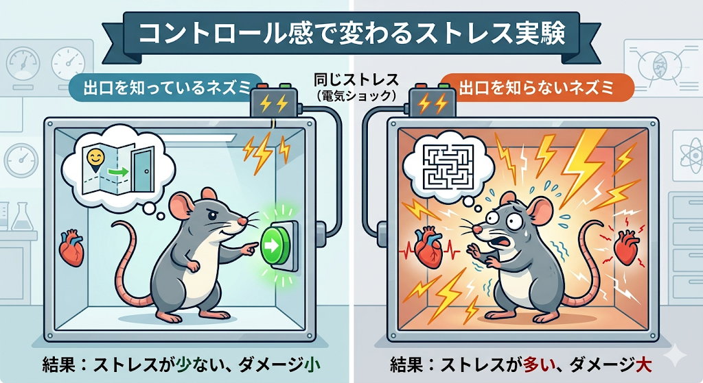 何をしてもストレスは止まらず、自分ではどうにもできないBのネズミに対して同じストレスを加えたところ、スイッチを押す押さないに関わらずAのネズミのほうがストレスが圧倒的に少なかったという結果があったみたいです。
